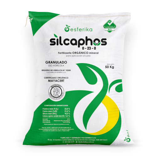 Fertilizante orgánico granulado rico en Fósforo, Calcio, Silicio y Carbono Orgánico, fundamental para el crecimiento y desarrollo de la planta.